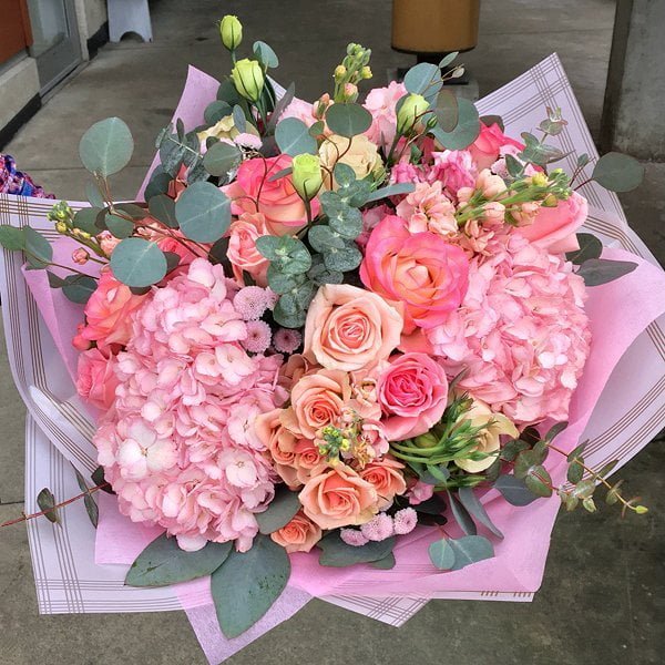A gorgeously feminine bouquet in monochromatic pink that will bring harmony to someone you love. Pretty pink roses, hydrangea, stocks lisianthus and fragrant eucalyptus, a great gift for Women’s day, Mother’s Day or any day!