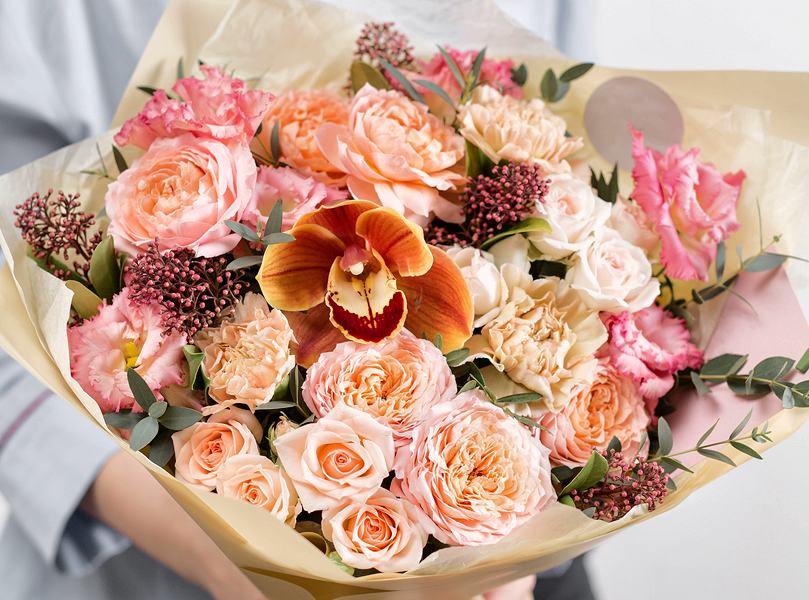 A luxury mix of creamy, peachy, pink blooms, comprised of carnations, lisianthus, roses, skimmia and eucalyptus with one perfect cymbidium orchid in the center. A wonderful surprise for Mother’s day, women’s day, birthday, or Valentine’s Day.