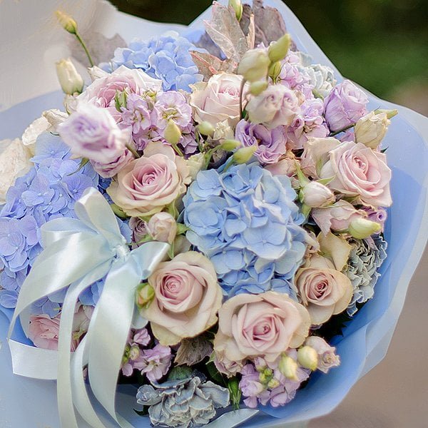This luxury bouquet of soft pastel tones is composed of soft pink roses, baby blue hydrangeas, lavender lisianthus and stocks, and unique blue carnations. An exquisite gift for the special person in your life for Valentine’s Day, Mother’s Day, Women’s day or any important occasion.