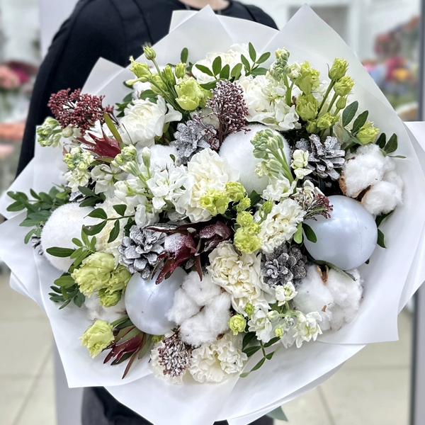 White Christmas bouquet looks like a winter snow storm. The flower bouquet consists of white roses, carnations, stocks, some evergreen foliage, and bog white balls as a decoration.