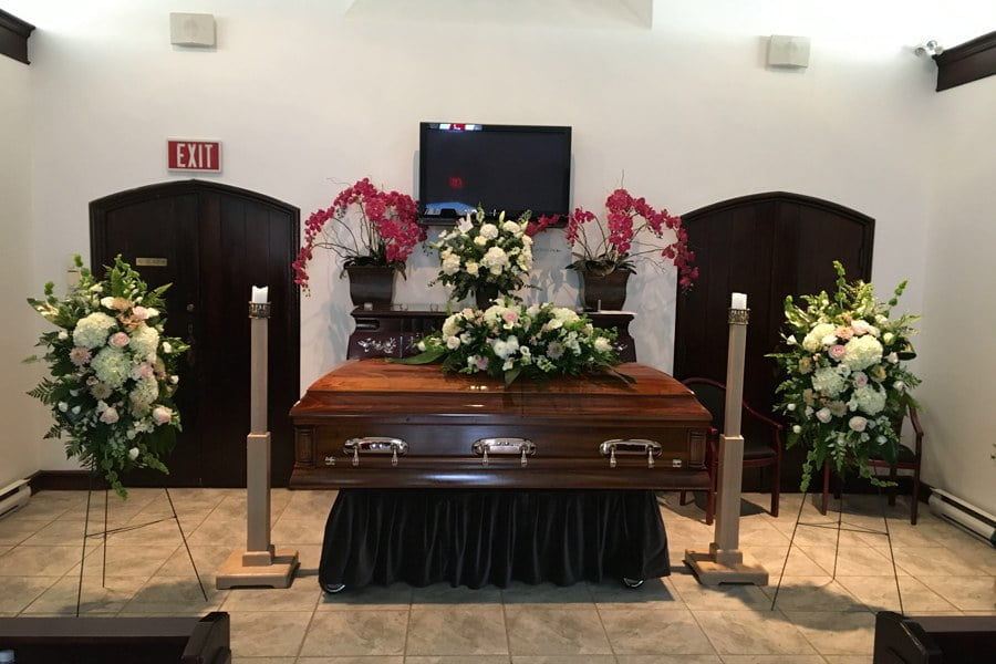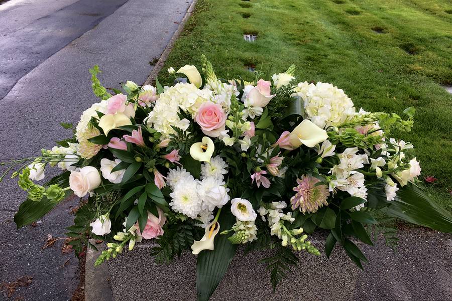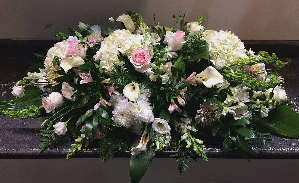 This casket spray of soft pastel tones contains roses, calla lilies, lisianthus, snapdragons, disbuds, alstroemeria, hydrangea, bells of Ireland, ornithogalum, chrysanthemums and an assortment of greenery.