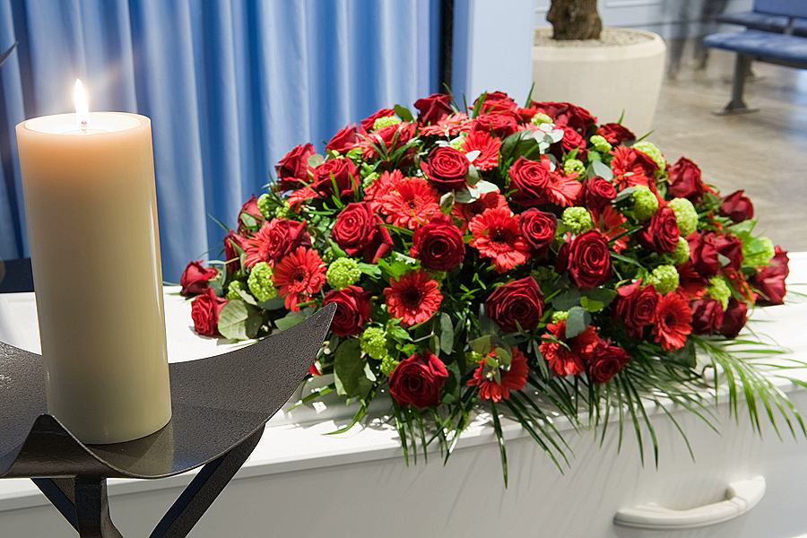 Red roses and gerbera daisies combine with green viburnum, eucalyptus and tropical greens in this traditional style casket spray.