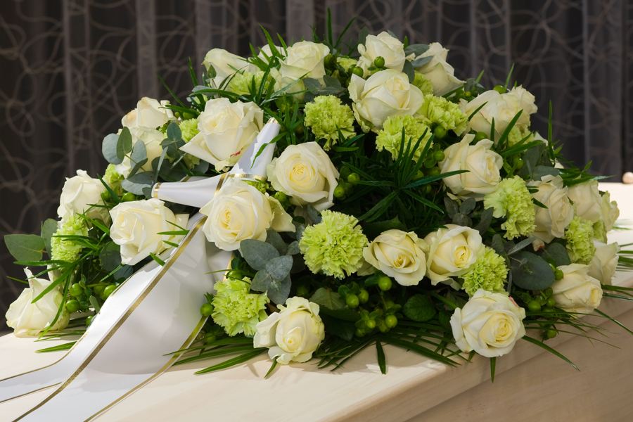 In elegant white and green, this casket spray contains green carnations and hypericum, white roses, eucalyptus and tropical foliage.