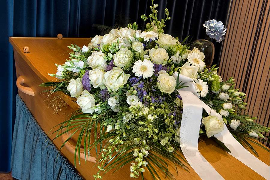 Mostly white with a bit of green and purple, this casket spray has agapanthus, trachelium, gerbera daisies, roses, larkspur, lisianthus, green disbuds, ornamental grasses, and palm leaves.