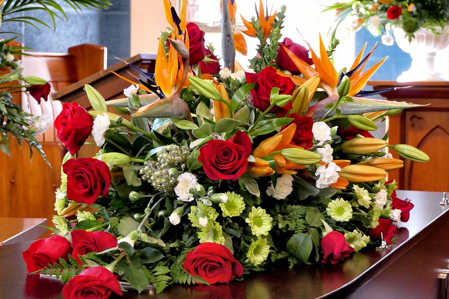Bright and bold this casket spray contains tropical birds of paradise, red roses, orange hybrid lilies, green chrysanthemums, white miniature carnations, and an assortment of foliage to complete it.