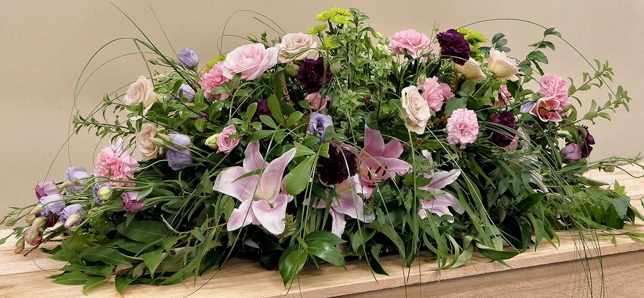 Soft pinks and lavender with a pop of burgundy and lime green. This casket spray has lilies, carnations, roses, lisianthus, chrysanthemums, with a combination of greenery and grasses.