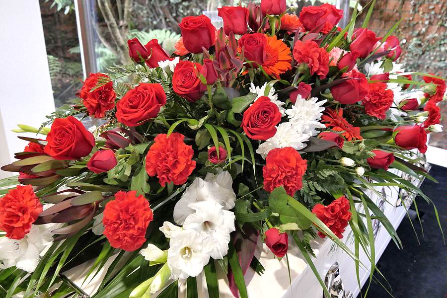 In royal red and white, this casket spray includes red roses, carnations, gerbera daisies, leucodendron, white chrysanthemums and gladiola with an assortment of tropical foliage.