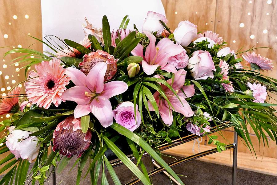 In pale monochromatic pink, this pretty casket spray has pink protea, gerbera daisies, carnations, hybrid lilies, roses and a lavish assortment of greenery.