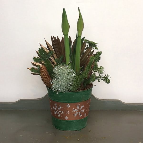 CH003 This beautifully crafted natural holiday amaryllis planter in a hand-made wild style pot with some Christmas decorations is a wonderful gift for a Christmas party.