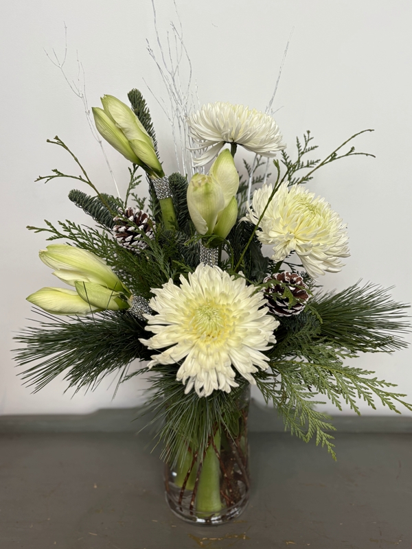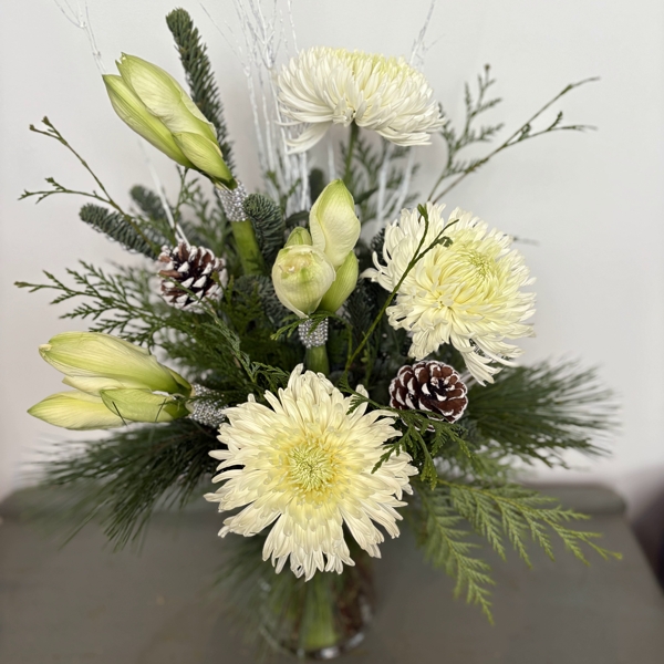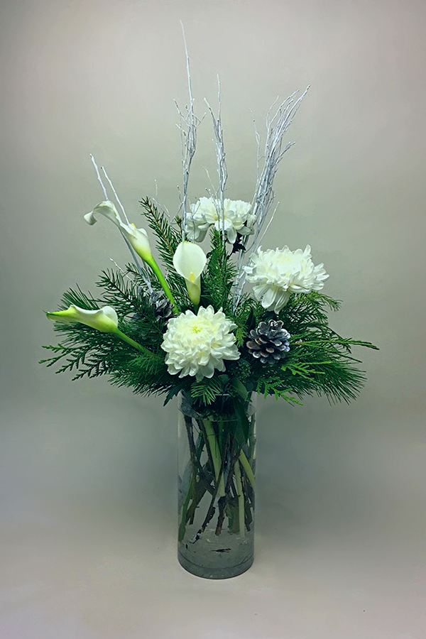 An elegant Christmas arrangement in a tall cylinder vase with white calla lilies or amaryllis, disbuds, fragrant evergreens, branches and cones.