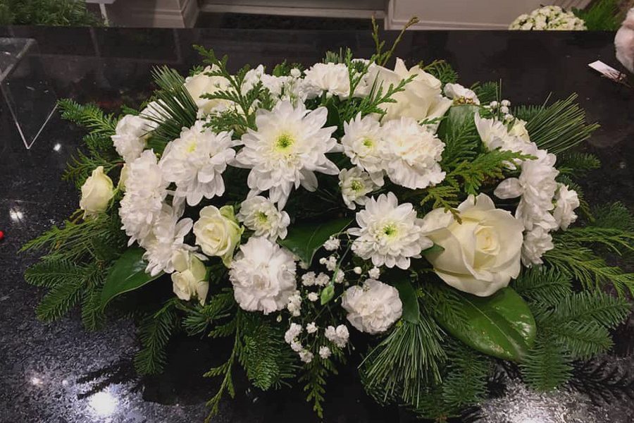 This full all white centerpiece is designed with fragrant evergreens, chrysanthemums, roses and spray roses, carnations and miniature carnations, and gypsophila in a plastic dish.