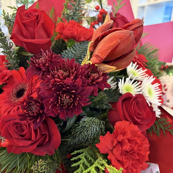 This vibrant arrangement is a Christmas-themed bouquet featuring a mix of red amaryllis, roses and gerberas and white flowers with seasonal greenery.