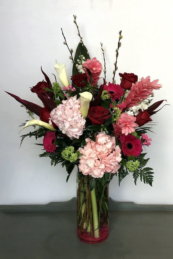 A stunning arrangement for Valentine’s Day, or anytime to show your love. This elegant display in a clear glass vase includes ginger, roses, hydrangea, calla lilies, stocks, gerbera daisies, bouvardia, viburnum and tropical foliage with pussy willow accents.