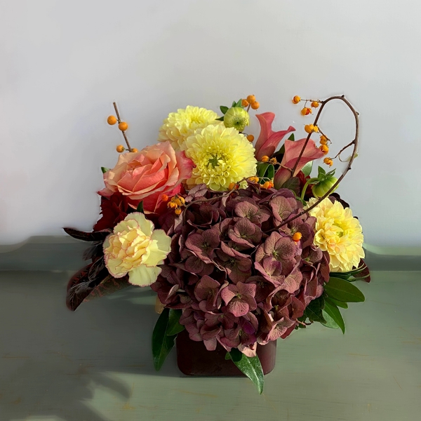 The round centrepiece in a 5’’ colourful cube can be made with a gorgeous ancient hydrangea, peach rose and callas, airy dahlias with some fall foliage and natural décor. This floral arrangement is a perfect gift for your family and friends.