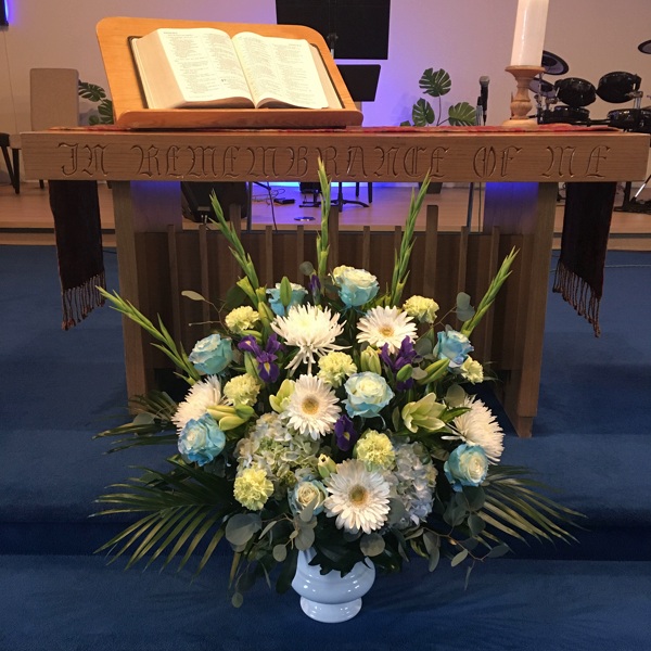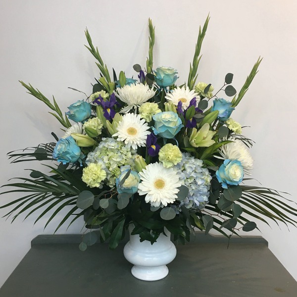 Offer a message of peace and comfort with our Serene Sky Blue and White Arrangement, a stately and elegant tribute designed to honor a beautiful life. This one-sided, fan-style arrangement is professionally presented in a classic white ceramic pedestal vase, creating a dignified focal point for a funeral service, memorial, or a family’s home.