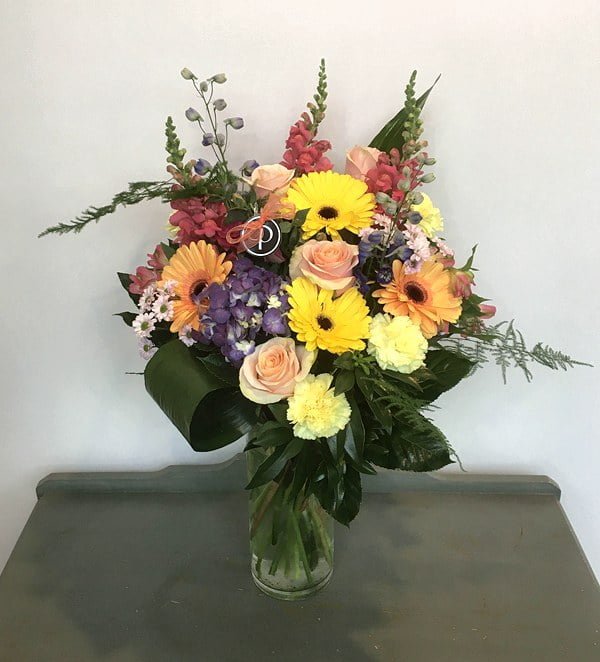 In a tall cylinder vase this arrangement includes delphinium, carnations, gerbera daisies, snapdragons, roses, hydrangea, alstroemeria and assorted foliage.