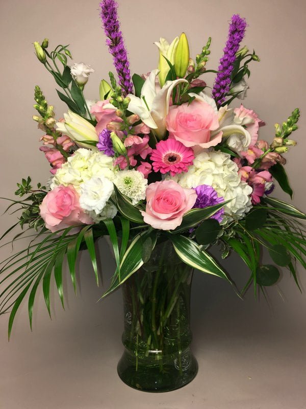 A luxury arrangement of feminine tones of pink and purple. Liatris, roses, hydrangea, gerbera daisies, lisianthus, snapdragons and carnations are enveloped by lush tropical greenery in an elegant vase with a silver ball accent inside! A very special gift for that very special someone!