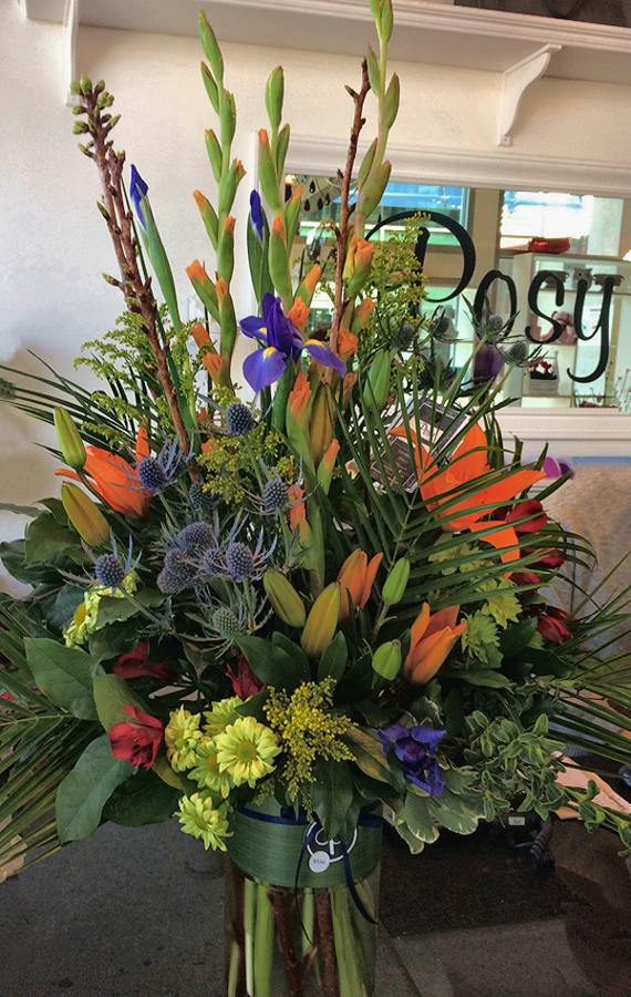 This lush mixture of orange hybrid lilies, blue iris, orange gladiola, eryngium, green mums, red alstroemeria, solidago and palm leaves arranged in a clear cylinder vase will add a bit of luxury to any event. From corporate events to Mother’s day or Women’s day, a spectacular gift to send!