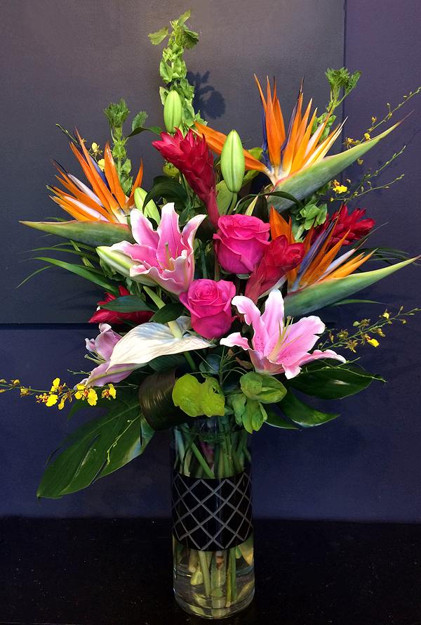 This luxurious tropical arrangement is a great gift for your Valentine or anyone special! In a modern glass vase it includes, birds of paradise, ginger, oriental lilies, anthurium, roses, bells of Ireland, oncidium orchids and tropical foliage.