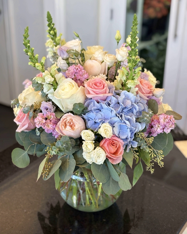 Experience the pinnacle of contemporary floral artistry with our Pastel Sky Garden Sphere. This opulent arrangement is a breathtaking symphony of soft, “candy-toned” hues, masterfully designed in a lush, rounded structure that offers a 360-degree view of beauty. Presented in a modern glass bubble bowl, this arrangement creates a stunning, immersive floral experience.