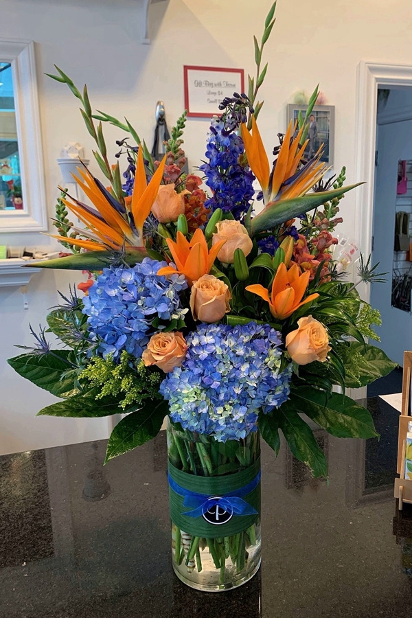 Bright and cheerful stunning floral arrangement in a blue-orange colours combination with bird of paradise, orange or peach roses, shocking blue hydrangeas, gladiolus, orange snaps, lilies, and a lot of tropical greenery.