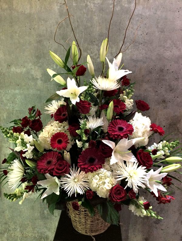 This traditional style basket arrangement is perfect for the front of a church or funeral home. It includes white lilies, disbuds, hydrangeas, snapdragons, red roses, gerbera daisies, alstroemeria, and miniature carnations with curly willow for extra height.