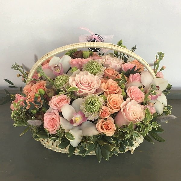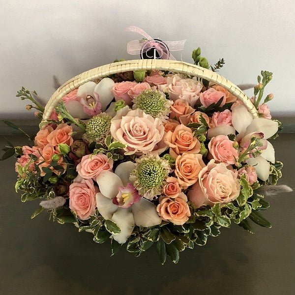 An elegant floral basket arrangement is prepared with many expensive and luxury flowers such as white or pink cymbidium orchid blooms, pink disbuds “Momoko”, light pink garden and spray roses, fragrant stocks, and some greenery foliage.