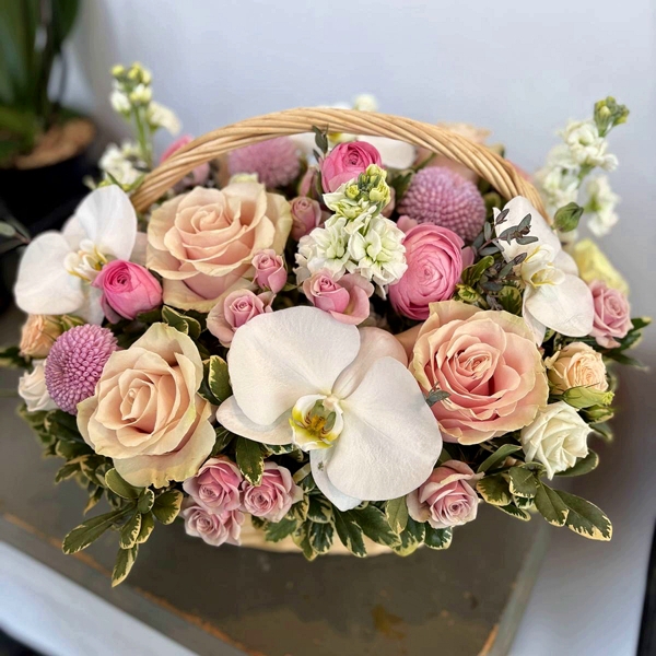 An elegant floral basket arrangement is prepared with many expensive and luxury flowers such as white phalaenopsis orchid blooms, pink disbuds “Momoko”, light pink garden and spray roses, fragrant stocks, and some greenery foliage.