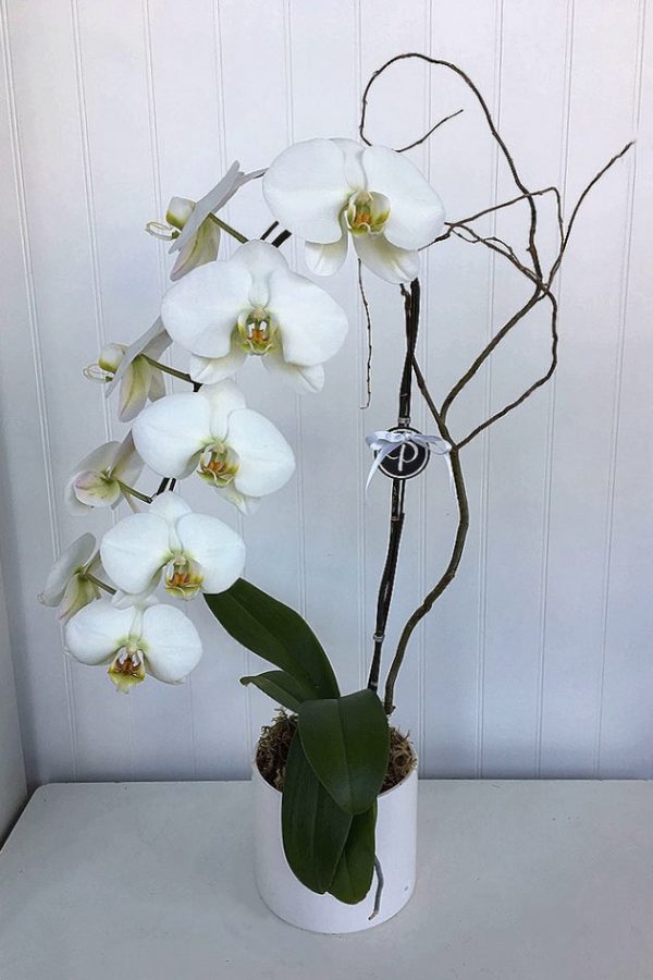 White waterfall orchid plant in a ceramic pot with a curly willow branch.