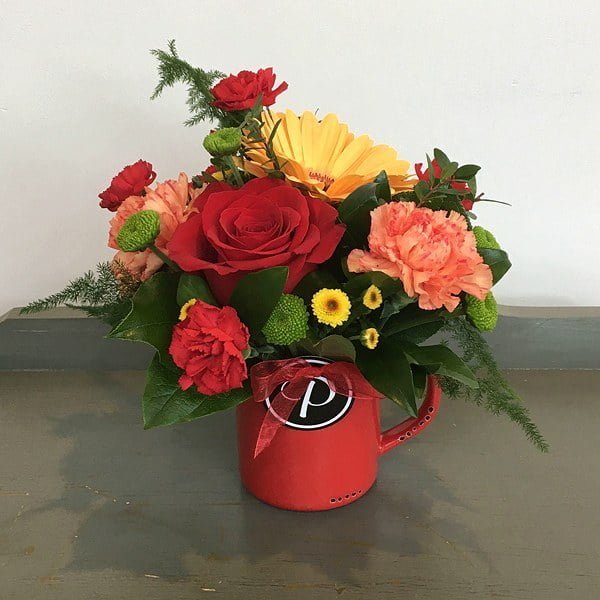 Red Mug Flower Arrangement – All our Posies have a piece of our soul in them. They are made in a 4″ cube or cylinder.