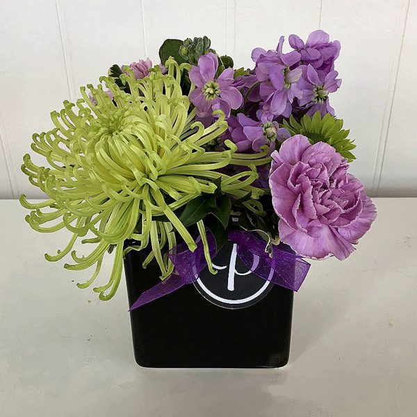 Green and Lavender Flower Arrangement – All our Posies have a piece of our soul in them. They are made in a 4″ cube or cylinder.