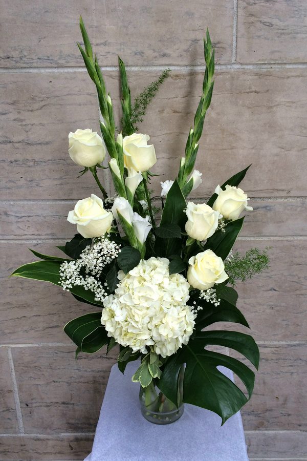 A modern linear design in a clear glass vase. This elegant arrangement includes white gladiola, roses, hydrangea tropical foliage and gypsophila.