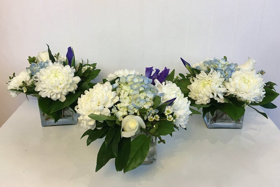 Peaceful blues and whites, arranged in a 5” glass cube with blue hydrangea, iris, white disbuds, white roses, waxflower and greenery.