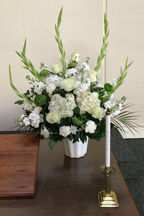 This one-sided arrangement makes a statement in all white and green. It includes gladiola, roses, stocks, hydrangea, carnations, disbuds, hypericum, and chrysanthemums with palm leaves and other foliage.