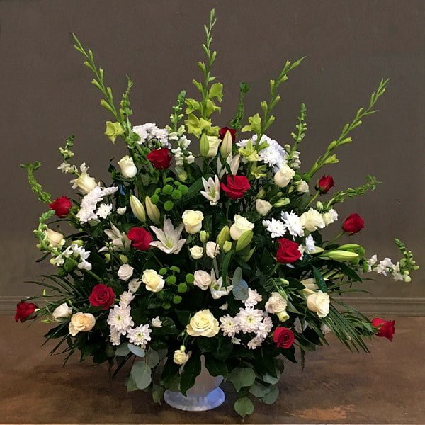 This sizeable, showy one-sided arrangement with green gladiola and button mums, white snapdragons, mums, roses, lisianthus and oriental lilies, and red roses makes a grand statement!