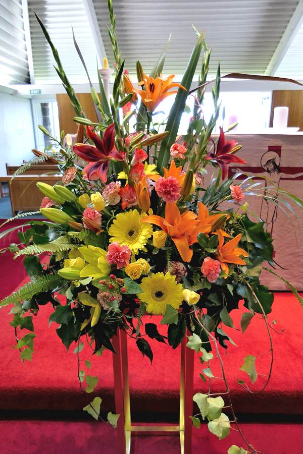A bright explosion of fall colours! This arrangement of orange, red and yellow hybrid lilies, gladiola, carnations, yellow roses and gerbera daisies, red hypericum, fern leaves and ivy makes a stunning tribute.