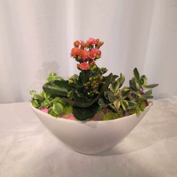 Mix of succulents and kalanchoe covering the colourful stone crumb.
