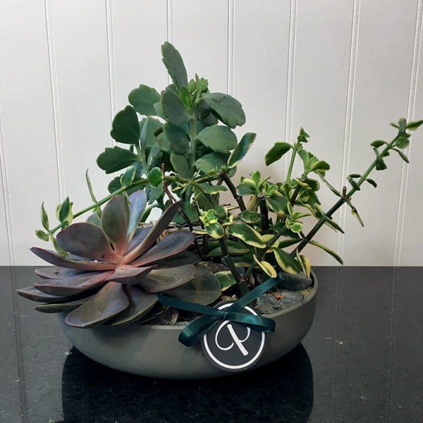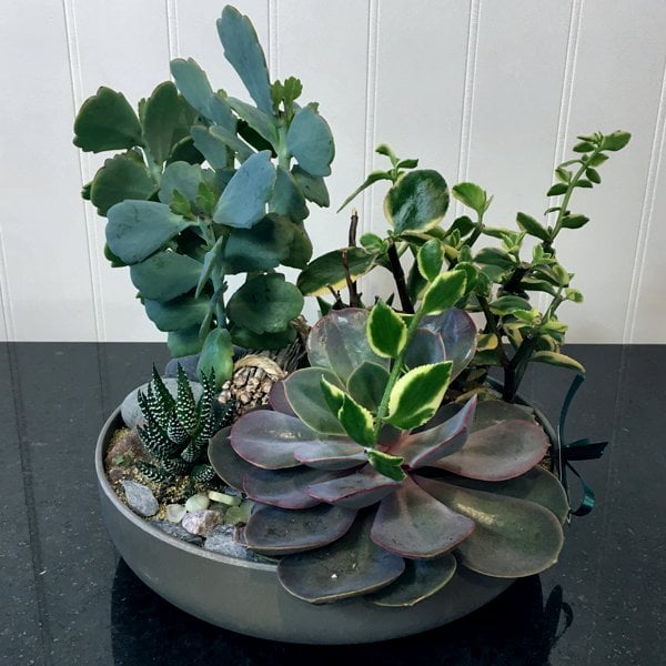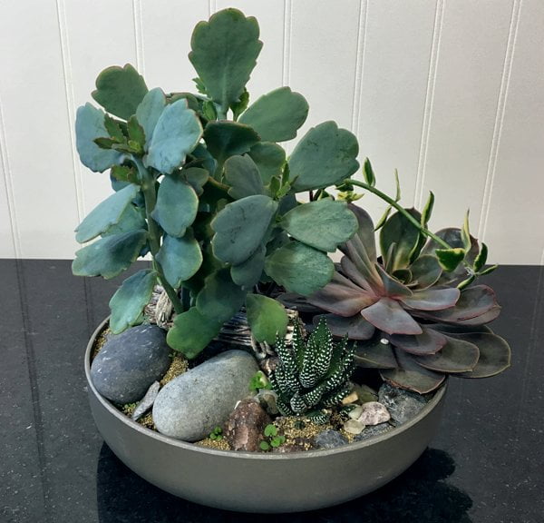 A low plastic round dish with a variety of succulents topped with river rock. The dish may be changed.