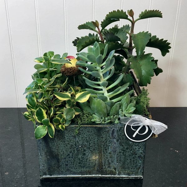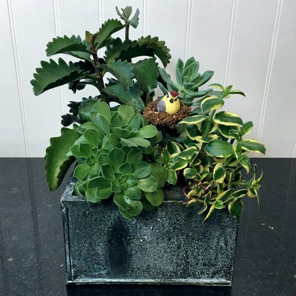 A metal container with an assortment of succulents topped with reindeer moss and a pretty nesting bird. The pot may be changed.