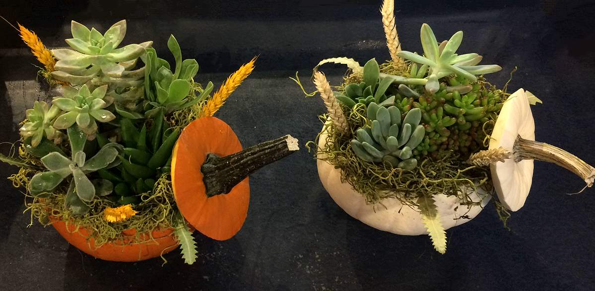 Succulent In Pumpkin Thanksgiving Flower Arrangement is a real pumpkin filled with a variety of succulents and decorated with Spanish moss and wheat stems.