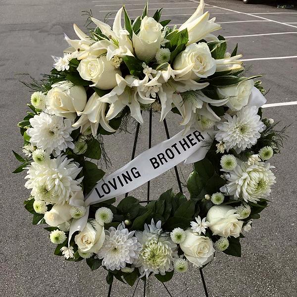 Includes: easel, wet floral foam, green foliage, roses, disbuds, lilies, mums button. The sign may be different.